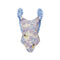 Charming one-piece swimsuit featuring a delicate floral and bee print in shades of lavender and light blue. The shoulder straps are adorned with light blue floral embellishments. It comes with a matching sarong, showcasing the same print and tied with a soft blue sash. A delightful ensemble for a sunny day.
