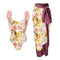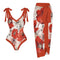 This elegant one-piece swimsuit features a vibrant floral print in shades of red and white, complemented by an orange trim. It comes with a matching sarong, also adorned with the same floral pattern and tied with an orange sash. A stylish choice for the beach or poolside.