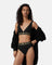 Black Versace bikini set featuring a gold Greca pattern and Medusa logo.