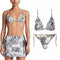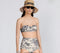 A vintage-inspired high-waisted bikini with a black-and-white toile de Jouy print, paired with a bandeau top, accessorized with a straw Dior hat and black sunglasses for a chic resort look.