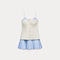 A sleeveless pleated mini dress with a buttoned corset-style top and a blue pleated skirt