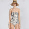 Strapless one-piece swimsuit with black and white Toile de Jouy print.
