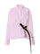 stylish long-sleeve shirt features a unique twisted design at the front, creating a draped effect. It comes with a contrasting black belt with a gold-tone oval buckle that cinches the waist, accentuating the shape. While it has long sleeves, the white color and potentially lightweight fabric could make it suitable for evenings