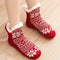 Soft, fleece-lined slipper socks featuring a festive red-and-white ,gray snowflake knit pattern for extra warmth and comfort at home.